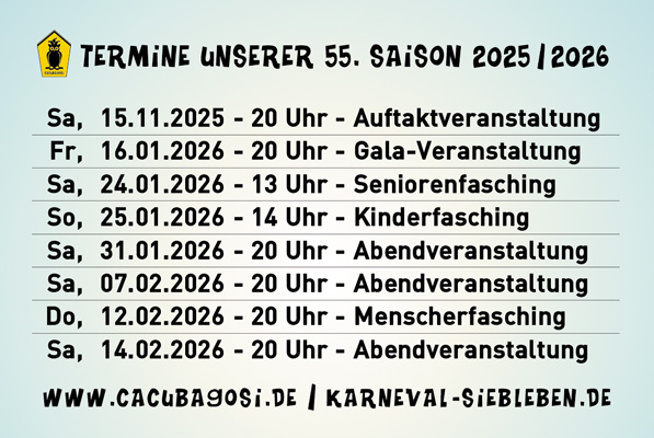 Unsere 55. Jubiläumssaison steht vor der Tür und bereits am Samstag, den 15.11.2025, starten wir um 20 Uhr im Siebleber Bürgerhaus “Vier Jahreszeiten” mit unserer Auftaktveranstaltung in eine Session voller Höhepunkte!