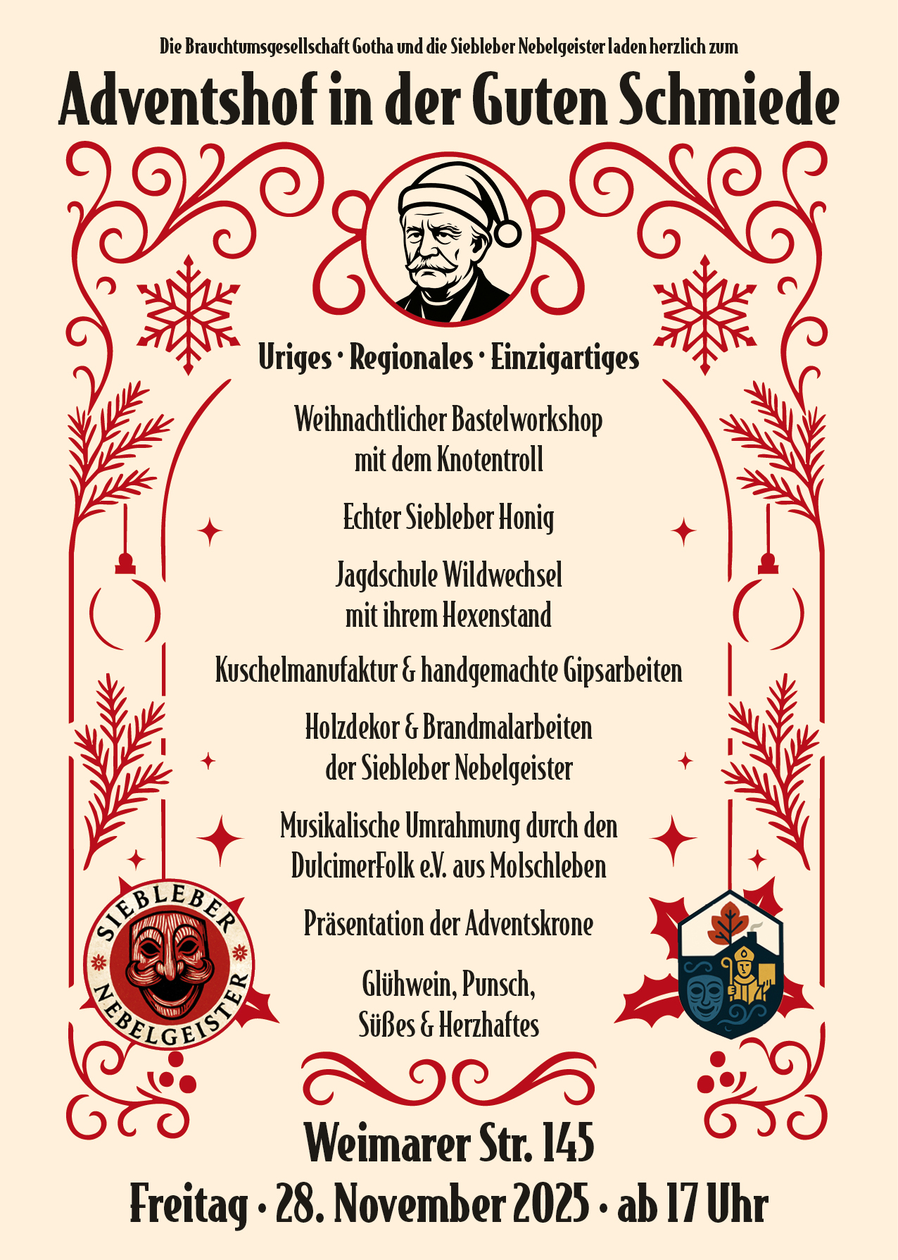 Anlässlich des fünfjährigen Bestehens der Siebleber Nebelgeister und der damit verbundenen Gründung der Brauchtumsgesellschaft Gotha laden wir euch herzlich zu unserem 5. Adventshof ein! 🌟
